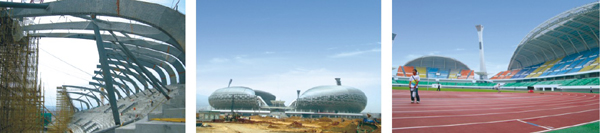 详述:泉州市海峡体育中心体育馆建筑上部分为钢筋混凝土框架结构,屋面采用钢结构,地上4层,地下2层,总建筑面积39500平方米,甲级体育建筑等级,可容纳观众人数8523人,屋面钢结构部分是由比赛馆、训练馆两部分组成,屋面结构形式为双曲线的预应力张弦桁架。体育馆屋盖结构主要由张弦桁架、屋面支撑壳、外环桁架三大部分组成。整个工程的重点和难点主要体现在预应力张弦桁架部分。训练馆屋面主桁架采用了8榀预应力张弦桁架,张弦梁为等腰三角管桁架形式。比赛馆部分屋面主桁架共7榀预应力张弦桁架,最大跨度94米,张弦梁采用了等腰和不等腰三角管桁架结构形式。该工程为第六届全国农运会主场馆之一。